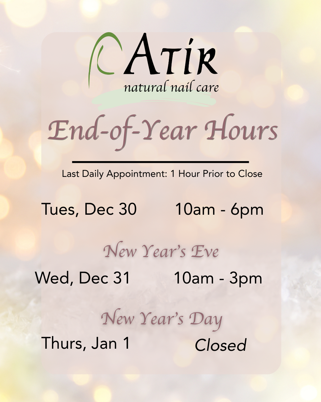 We kindly ask for at least 2 hours’ notice for cancellations to avoid being charged. No-shows may result in a charge of the full service amount.